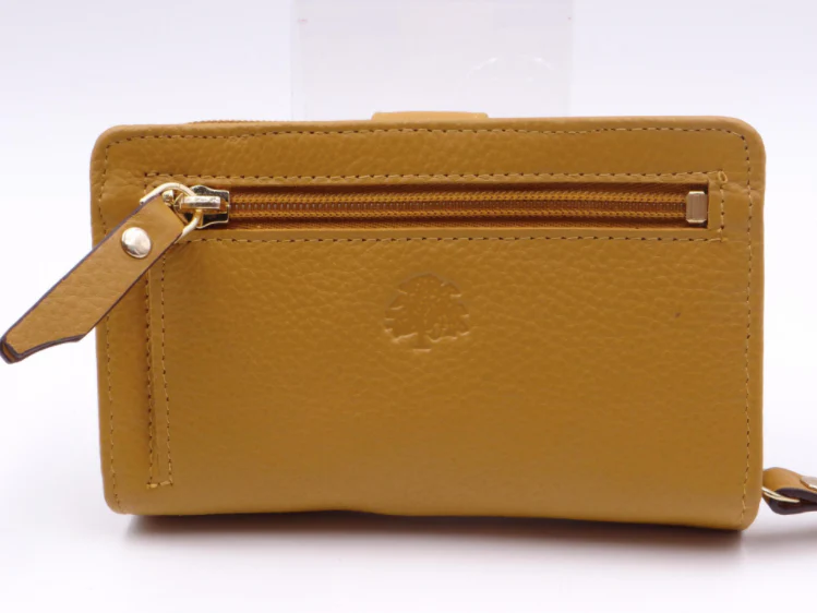 Soft Genuine Leather Medium Tab Dome Fastening Wallet with Zip Purse.Ā Multi Compartment with Eighteen Card Holder Slots.Ā One See Through ID Card Slot.Ā Coin Compartment with Zip Closure.Ā Two Note Compartments.Ā Rear Zip Closure Compartment.Ā Saffron with Gold Fittings.