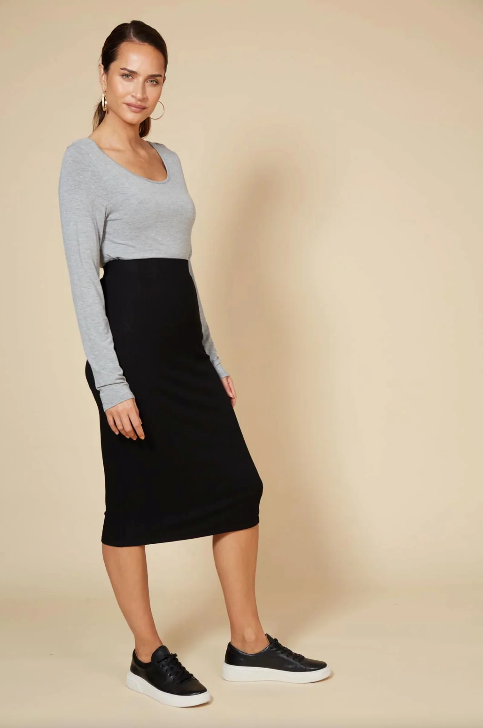 Features: Slim style, Elastic waist, Midi length, Ribbed stretch jersey.