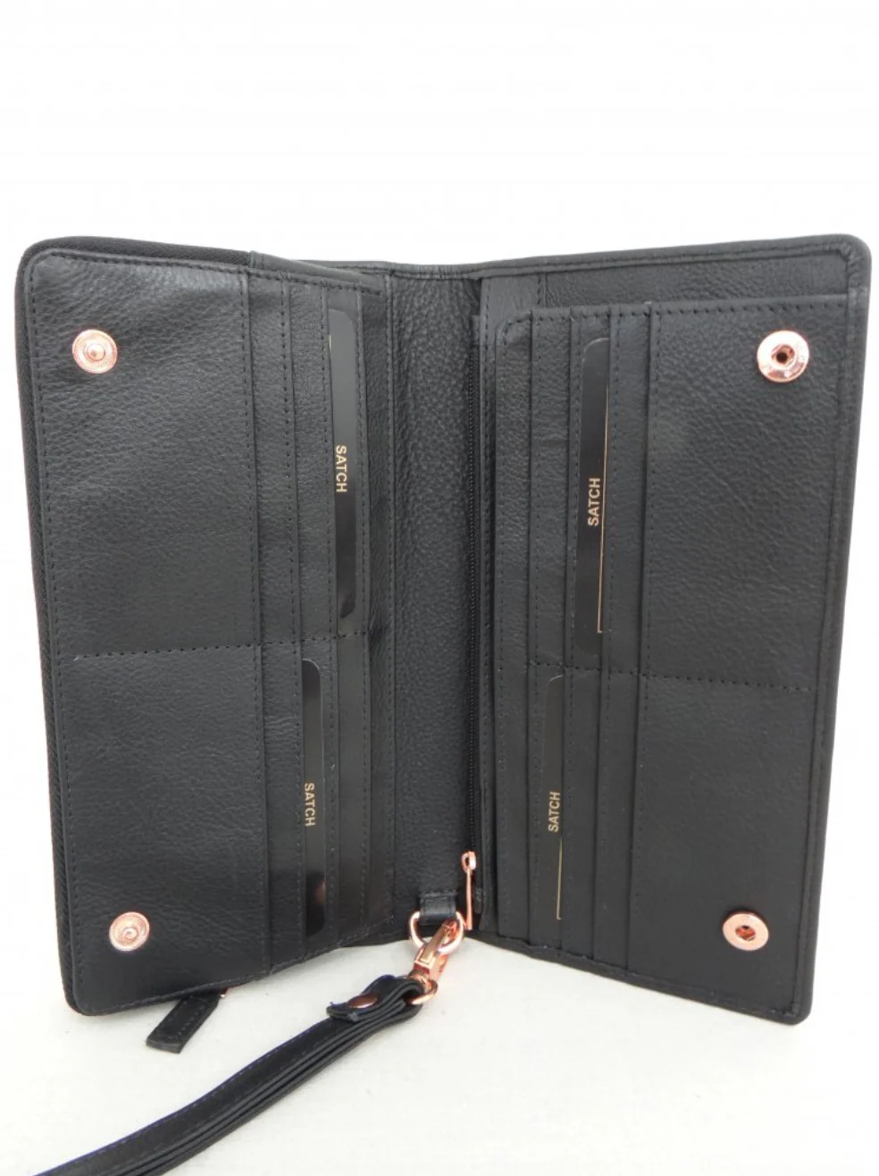 Genuine soft leather dome and zip closing wallet. 18 card compartment with internal zip pocket and separate note compartment. Detachable wrist strap.